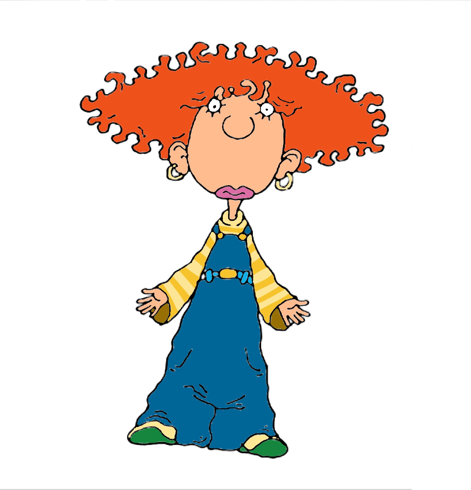 Ginger's most notable feature is her curly red hair that compliments her name. Otherwise, she’s a fair-skinned girl of average height. Her face resembles her father, except for her pink lips. Clothing wise Ginger seems to prefer a t-shirt and pants approach although she has been shown to wear skirts and dresses for special occasions. One of her trademark accessories is a matching pair of hair barrettes she often wears during middle school but stopped wearing them in high school.